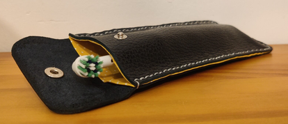 Pochette pour la brosse à dents cuir marine interieur jaune à pois blanc, couture fils argenté.