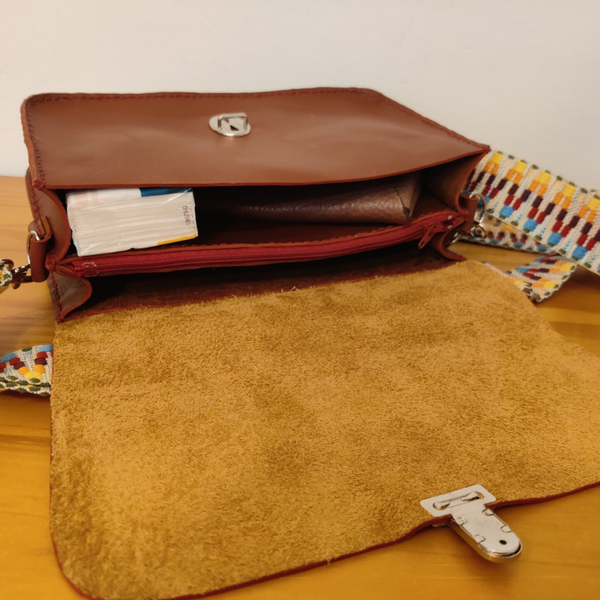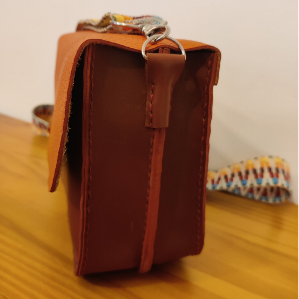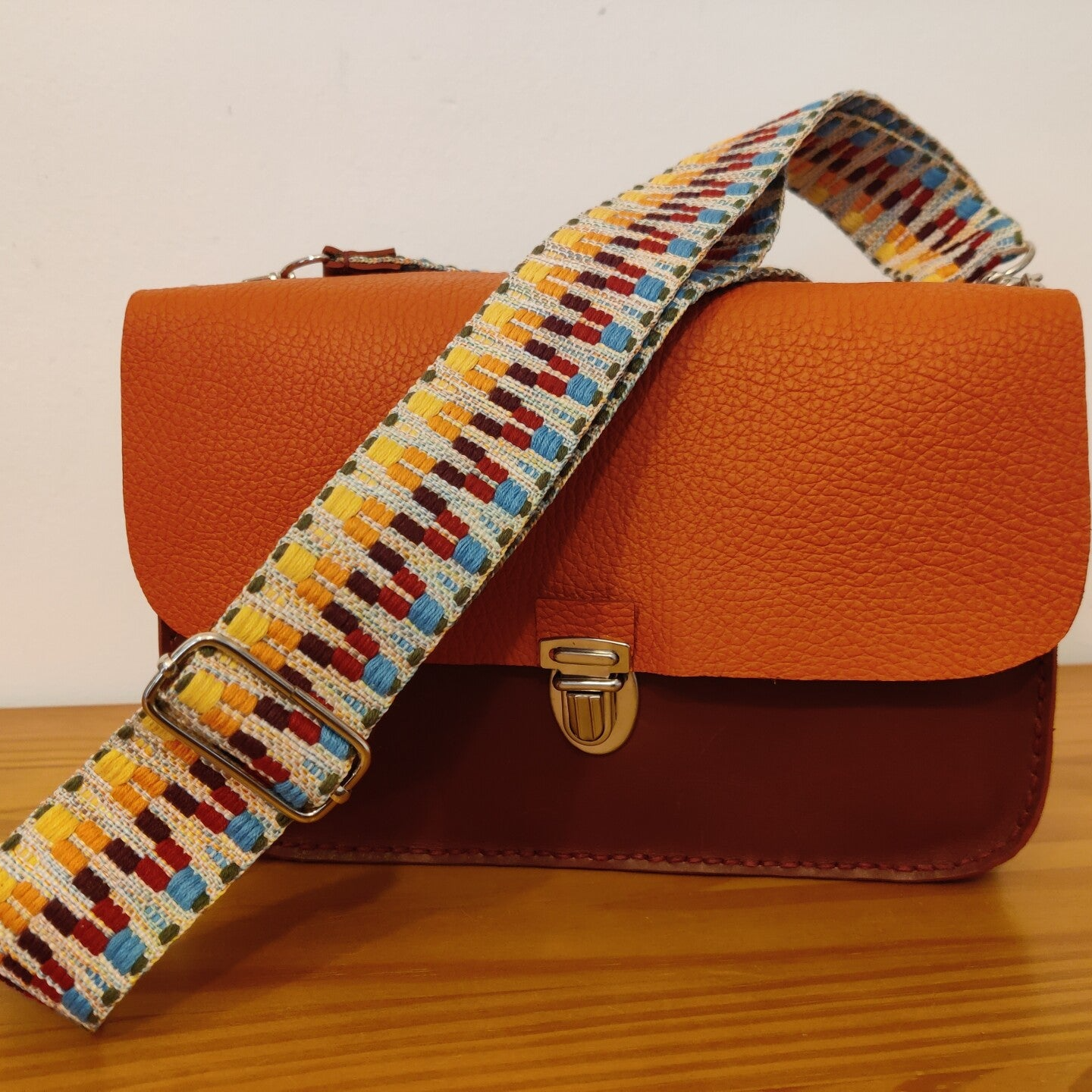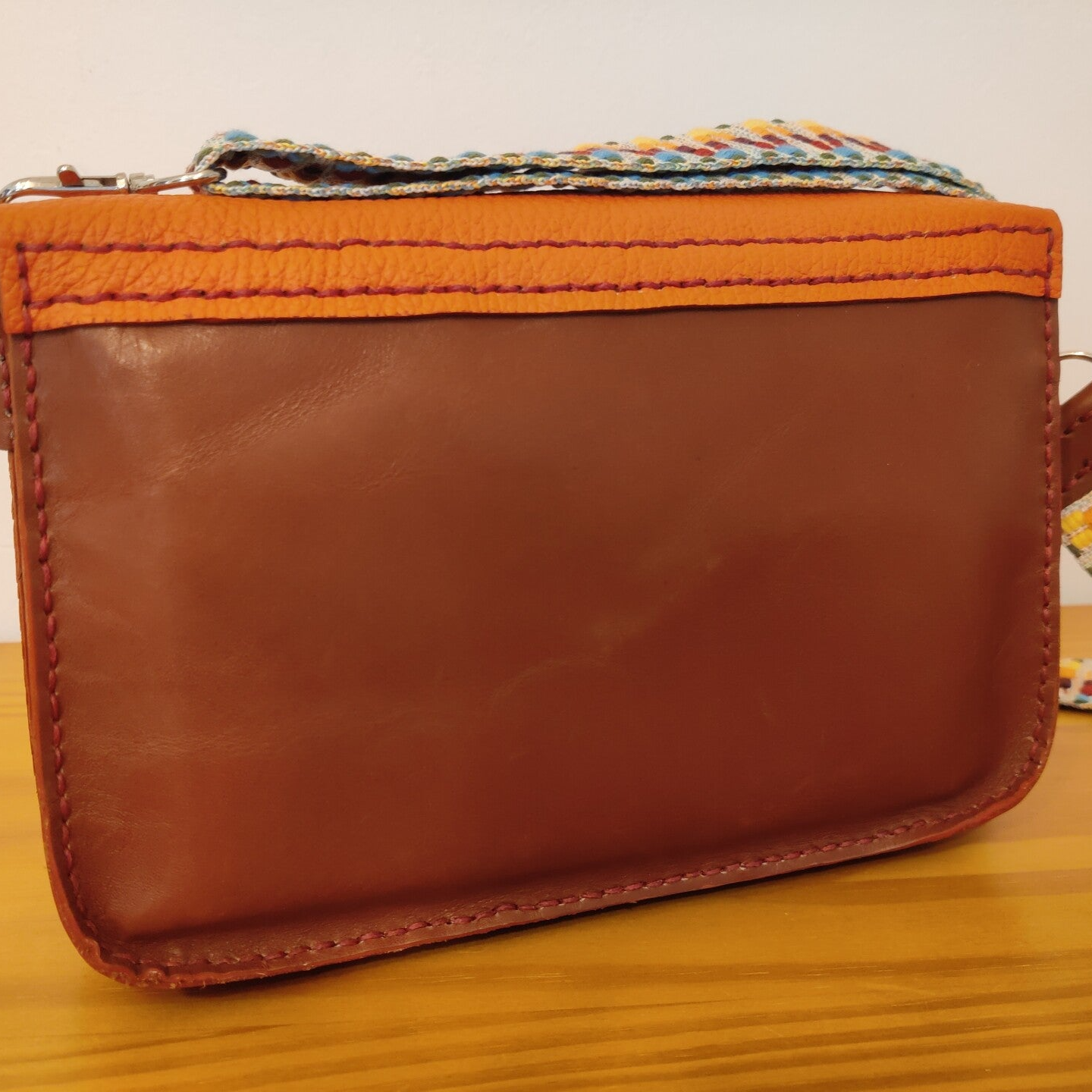 Sac à main bicolore (camel, rabas orangé) avec poche centrale cuir zippée et fermeture "cartable".
