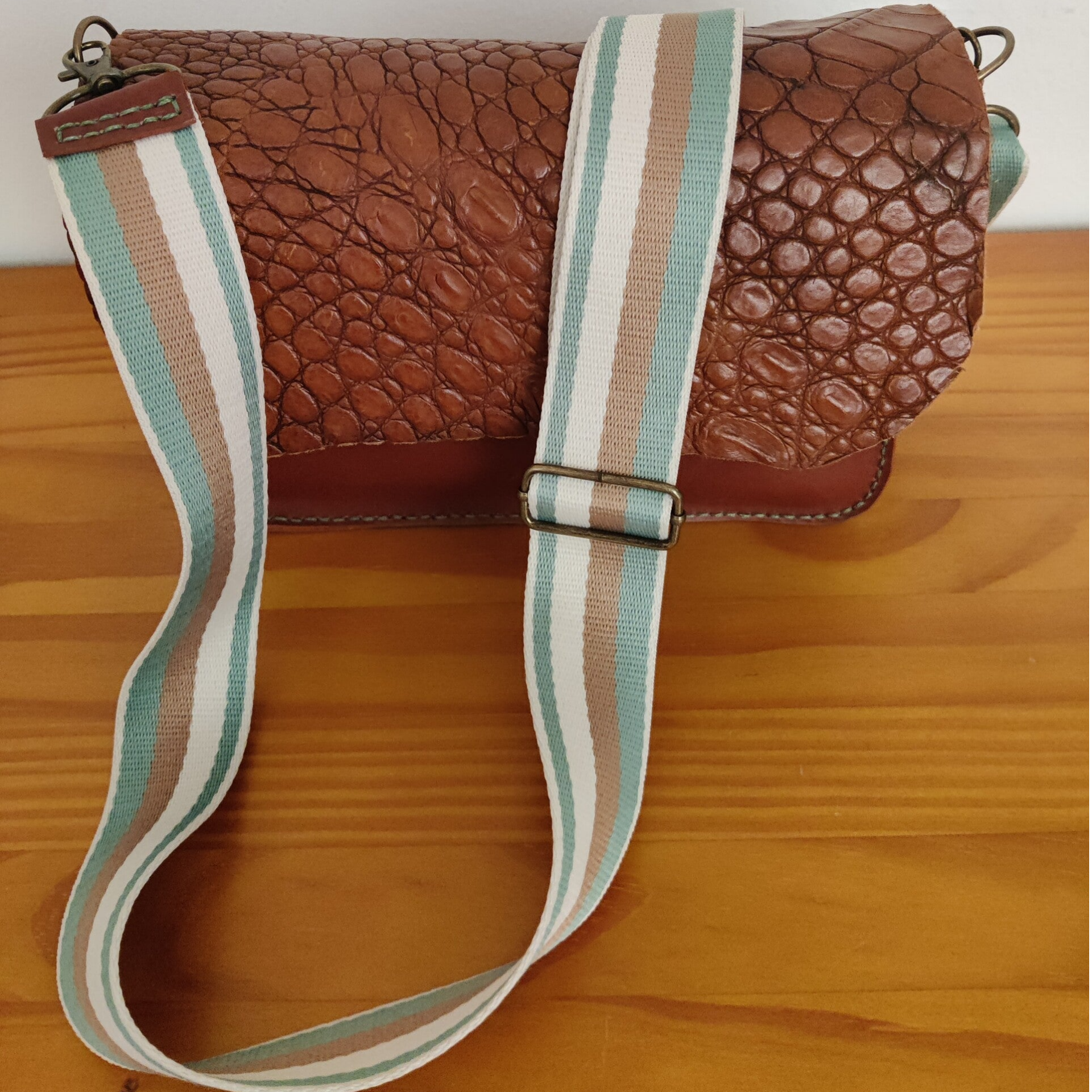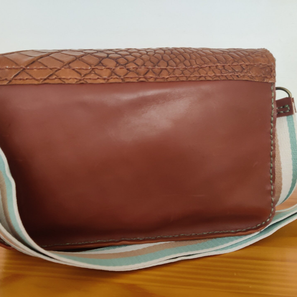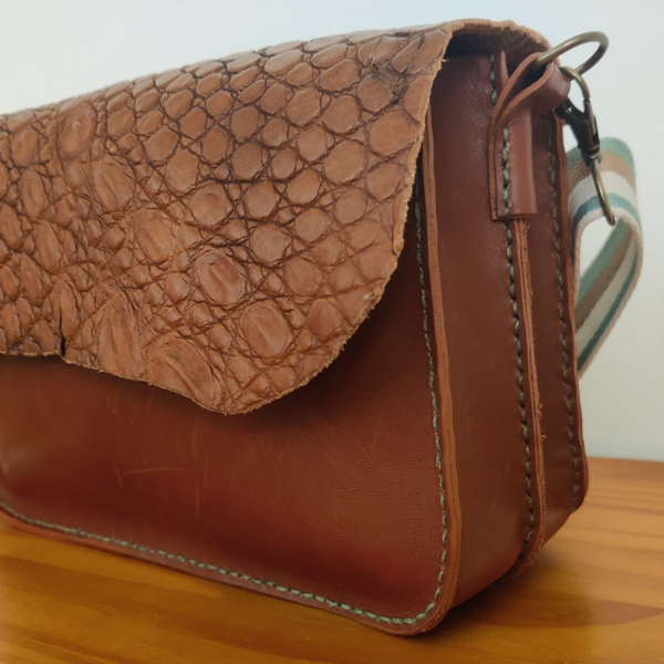 Sac à main bicolore (camel, rabas CROCO) avec poche centrale cuir zippée, maintien du rabas par 2 boutons aimantés.
