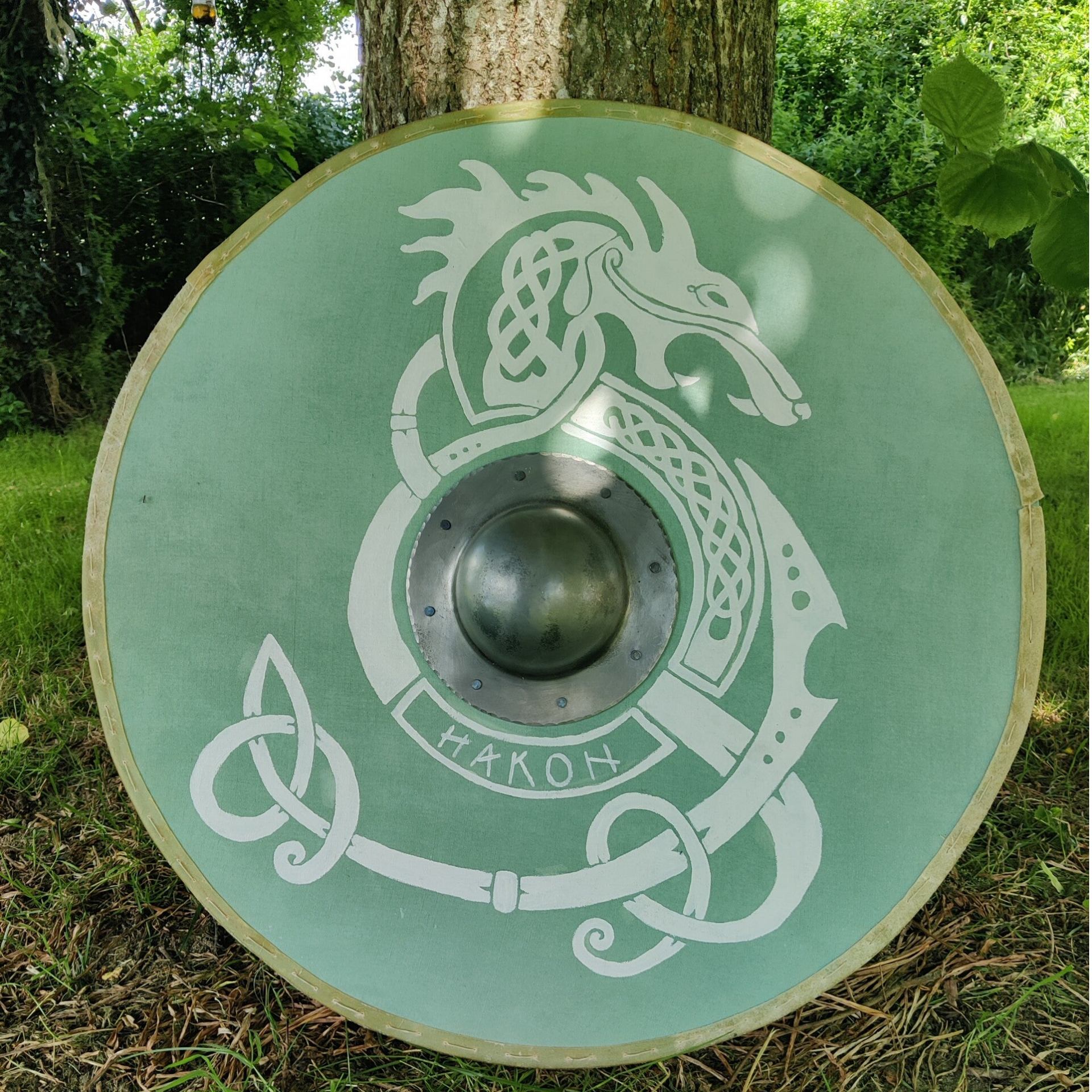Tissu encollé sur bois, l'umbo est une reconstitution historique, la protection circulaire en rawhide (cuir brut, non-tanné) est cousue, la poignée cloutée est une reconstitution inspirée de fouille.