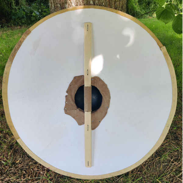 Tissu encollé sur bois, l'umbo est une reconstitution historique, la protection circulaire en rawhide (cuir brut, non-tanné) est cousue, la poignée BOIS cloutée est une reconstitution inspirée de fouille.
