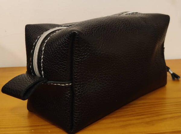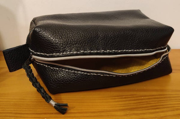 Trousse de toilette doublée tissu enduit jaune à pois blanc, couture fils argenté.