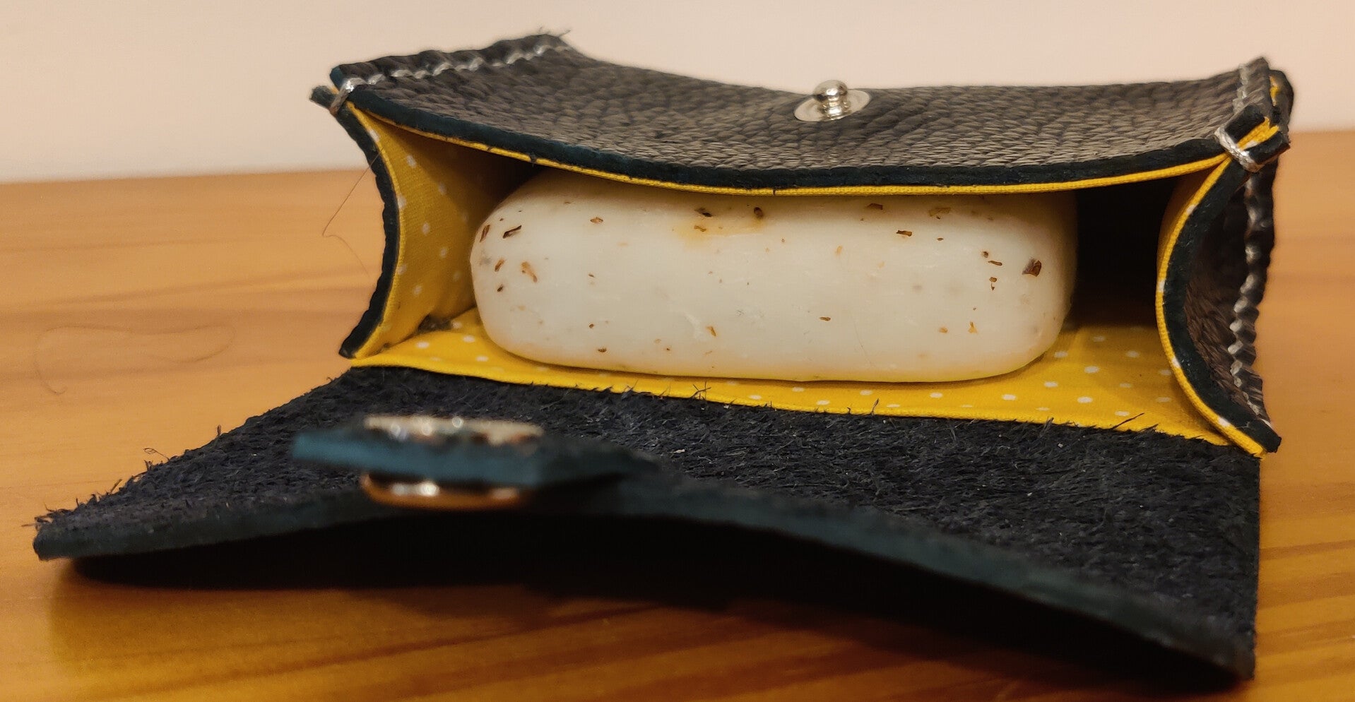 Pochette pour le savon ou petits accessoires en cuir marine, interieur jaune à pois blanc, couture fils argenté.