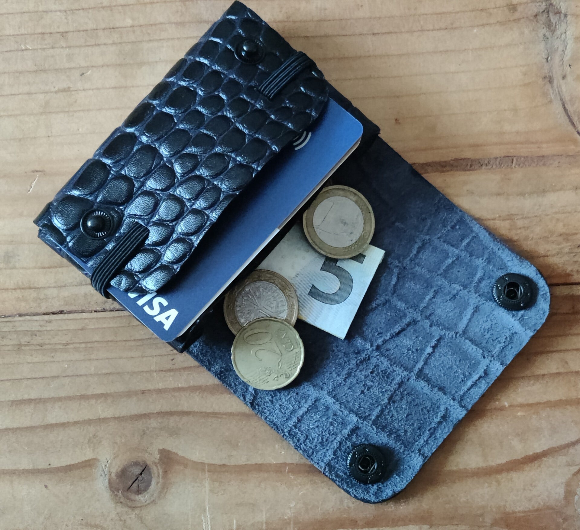 Carte d 'identité et permis de conduire sont maintenant au format d'un carte bancaire. Voici un mini porte feuille au format CB, avec espace monnaie et billets. Équipé d'un élastique il s'adapte facilement.
