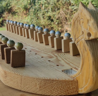 Le plateau en forme de coque de bateau est percé de 37 trous qui accueillent les guerriers qui vont s'affronter pour remporter le bateau jusqu'a ce qu 'il n'en reste qu'un.